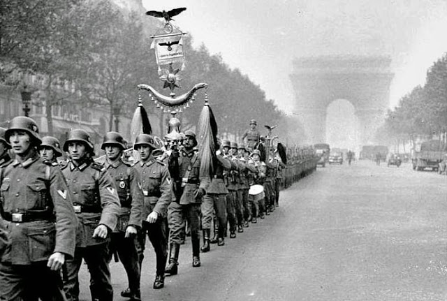 Na foto do famoso cartão postal de Paris, podemos ler a frase "Deutshland siegt auf allen fronten", com o imenso "V" na parte de cima. Traduzindo esta frase: "A Alemanha é vitoriosa em todas as frentes" e o "V" significa Vitória.