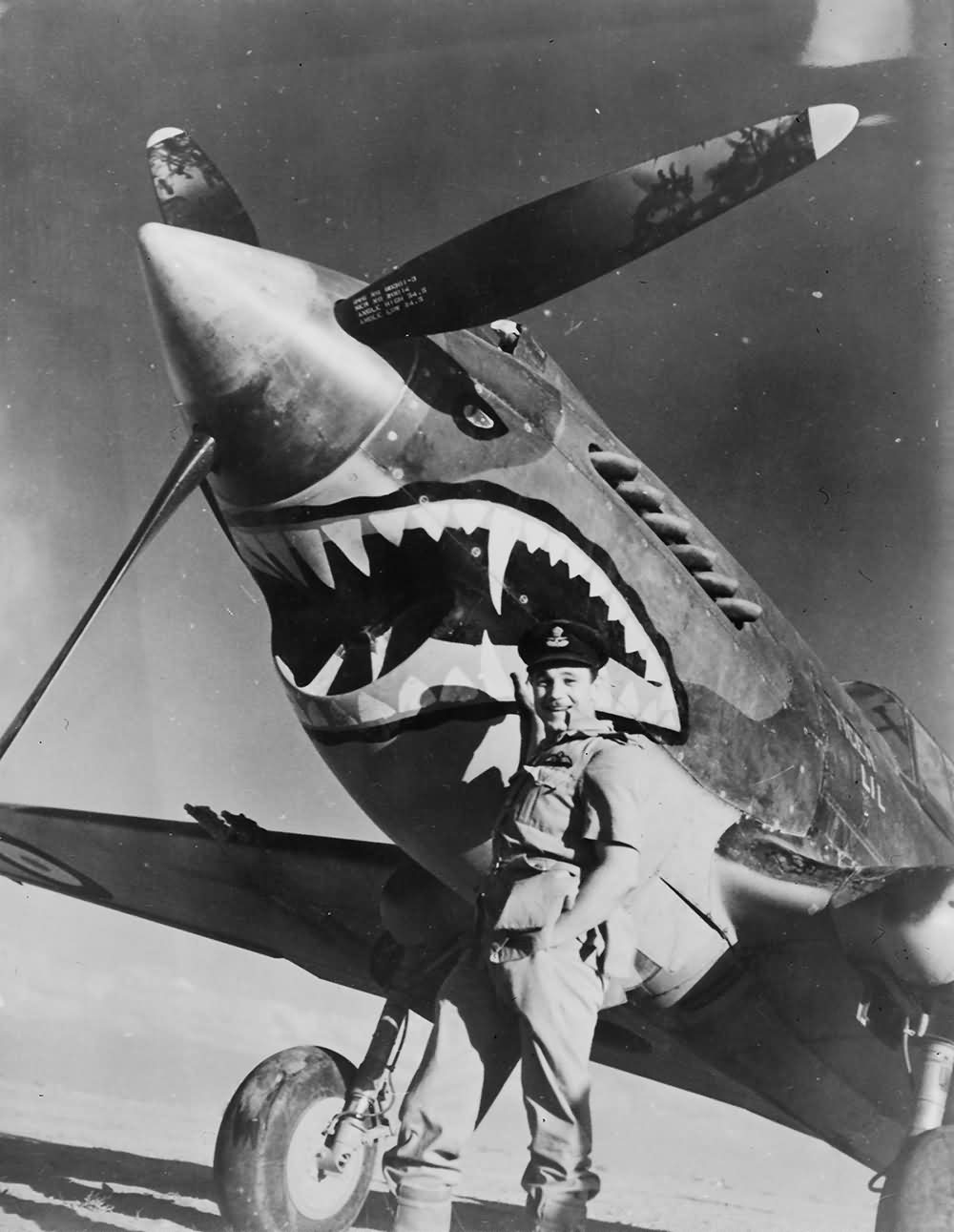 “The Shark Squadron” havia recebido seus caças Curtiss em julho de 1941. A arte do nariz do esquadrão passou por muitas iterações antes que os aviadores britânicos definissem o projeto definitivo, uma vez que o tubarão apareceu enquanto o Esquadrão 112 estava servindo no Egito.