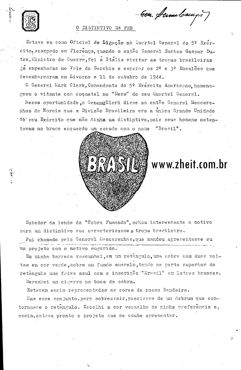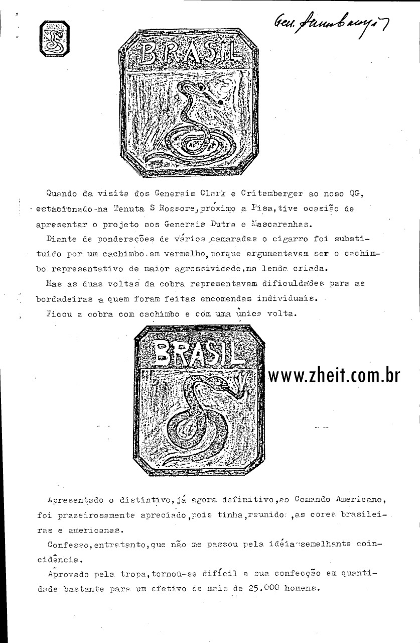 O Gen. Mascarenhas deu a missão de criar o emblema ao Tenente Coronel Senna Campos, do Estado Maior da Divisão. Eis o seu relato:
