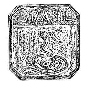 Em minha barraca rascunhei, em um triângulo, uma cobra com duas voltas em cor verde, sobre um fundo amarelo, tendo na parte superior do retângulo uma faixa azul com a inscrição 'Brasil' em letras brancas.