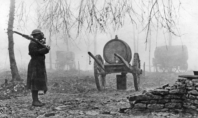 03- Um soldado americano fica de guarda durante um ataque de gás alemão na França, por volta de 1918.