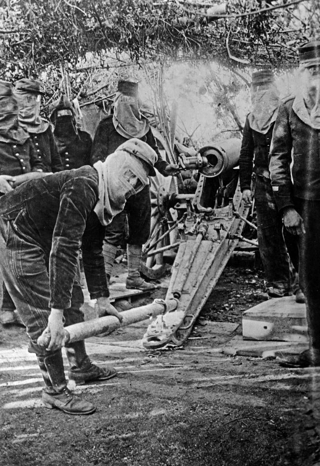 05- Agosto de 1915: soldados franceses carregam cartuchos de artilharia enquanto usam máscaras para proteger contra ataques de gás.