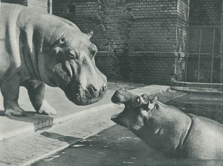 O zoológico que antes era rico com a sua diversidade de animais, acabou virando escombros, assim como toda a cidade. Mas, apesar dos danos, o zoológico tentava seguir com seu funcionamento, mas no dia 22 de abril de 1945, os seus portões foram fechados ao público, em virtude dos intensos ataques, que danificaram ainda mais o habitat dos animais. Os hipopótamos tiveram que ser realocados em um banheiro, onde a temperatura era mantida de maneira aceitável para a sobrevivência desses animais.