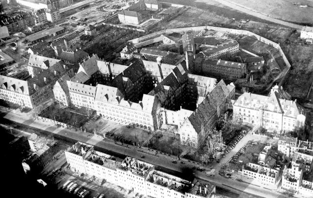 Vista aérea do Palácio da Justiça de Nuremberg, onde o Tribunal Militar Internacional julgou 22 dos principais oficiais alemães por crimes de Guerra. Nuremberg, novembro de 1945