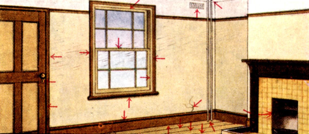 Tornando uma sala de refúgio à prova de gás: setas vermelhas destacam pontos de perigo.