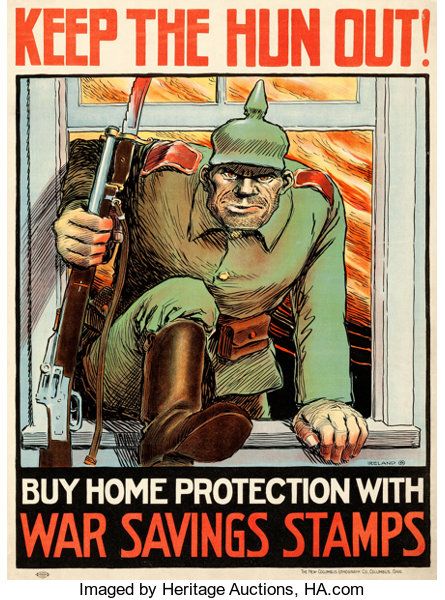 Isso pode ser visto, principalmente, em uma série de pôsteres projetados para convencer o povo americano a comprar títulos de guerra, nos quais o inimigo é mostrado como um bárbaro enlouquecido de sangue.