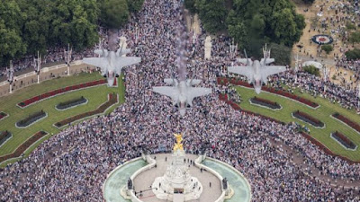 Logo depois ás 13 hrs em ponto, a família Real saiu para se unir ao público para assistir o maior espetáculo já visto nos céus. Quase cem aeronaves passando pelos céus: eram caças, aviões pesados, helicópteros, aviões novos e antigos... simplesmente apaixonante.