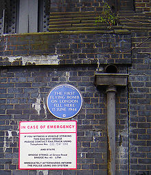 Em 13 de junho de 1944, o primeiro V-1 atingiu Londres próximo à ponte ferroviária em Grove Road, Mile End , que agora leva essa placa azul do patrimônio inglês . Oito civis foram mortos na explosão.